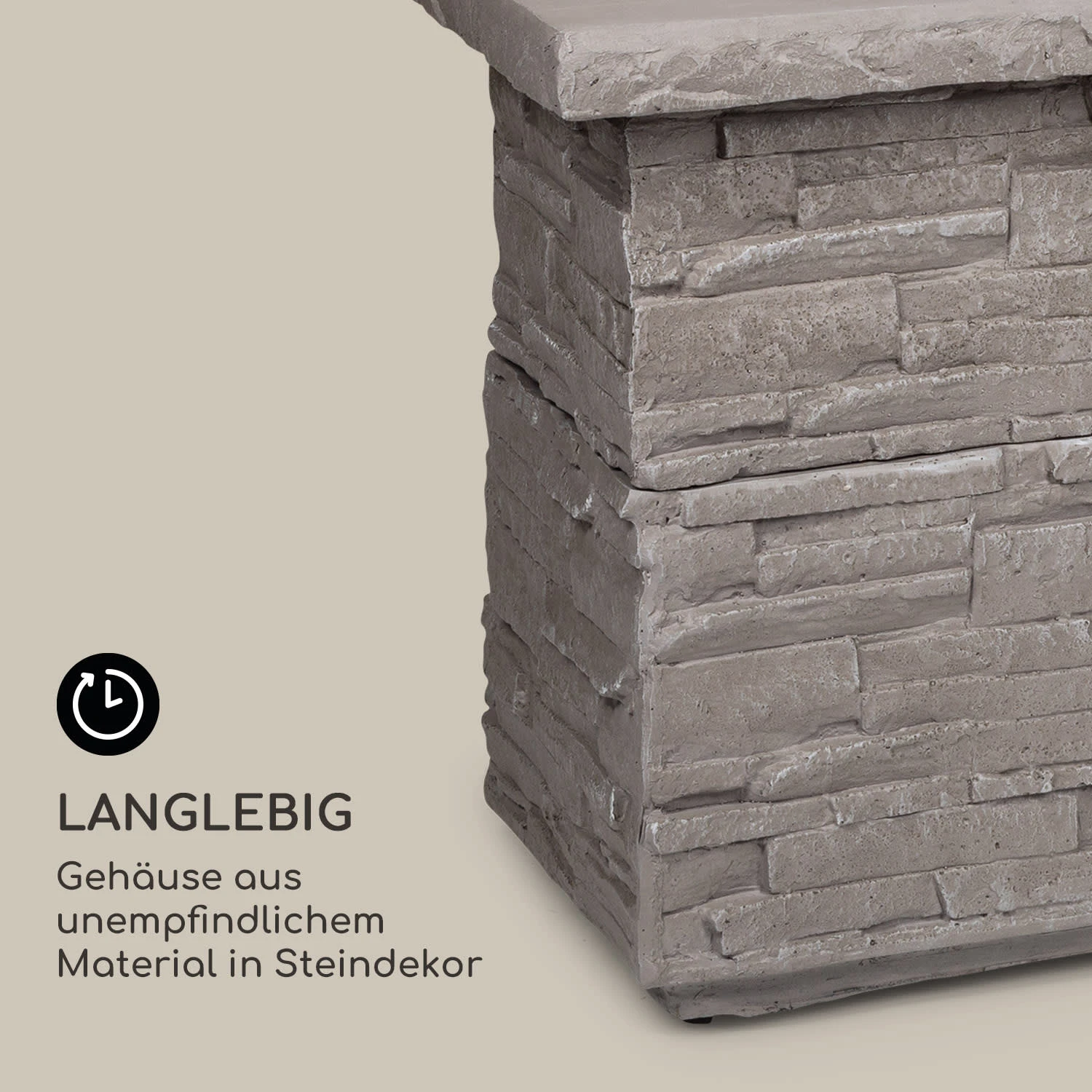 Mit der dekorativen blumfeldt Anafi Gas-Feuerstelle kannst du in deinem Garten ein wundervoll romantisches Feuer entfachen und zeitgleich einen praktischen Gartentisch installieren. Dabei besticht das rustikale Design im Steindekor und durch die perfekt eingelassene Abdeckung der eigentlichen Feuerstelle ist der exklusive Terrassenheizer wandelbar: mit nur einem Handgriff entsteht eine große Tisch- oder Ablagefläche. Nimmst du den exakt passenden Deckel ab, dann zeigt sich eine Feuerstelle, in welcher wärmende Flammen aus natürlichen Lavasteinen züngeln.