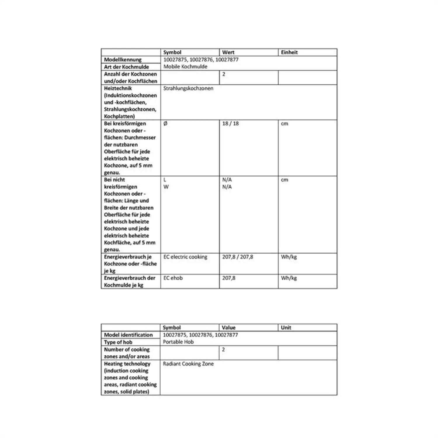 Energieverbrauch je Kochzone oder -fläche je kg (EC electric cooking): 207,8 / 207,8 Wh/kg