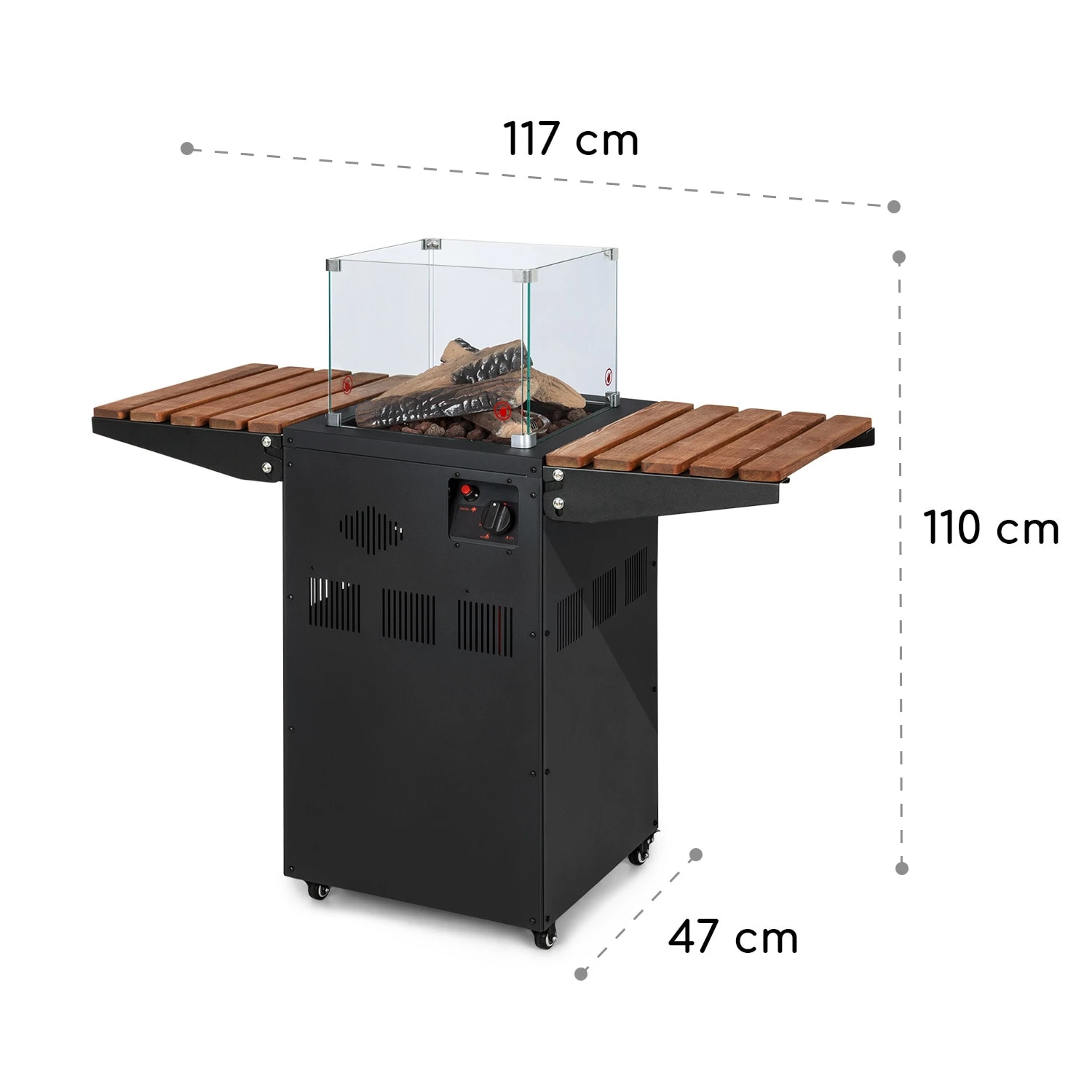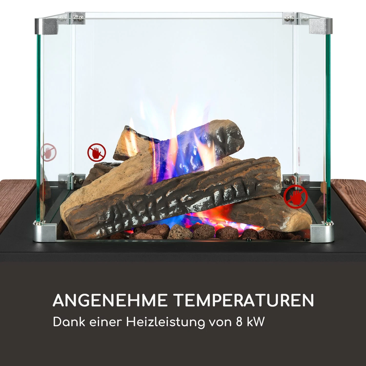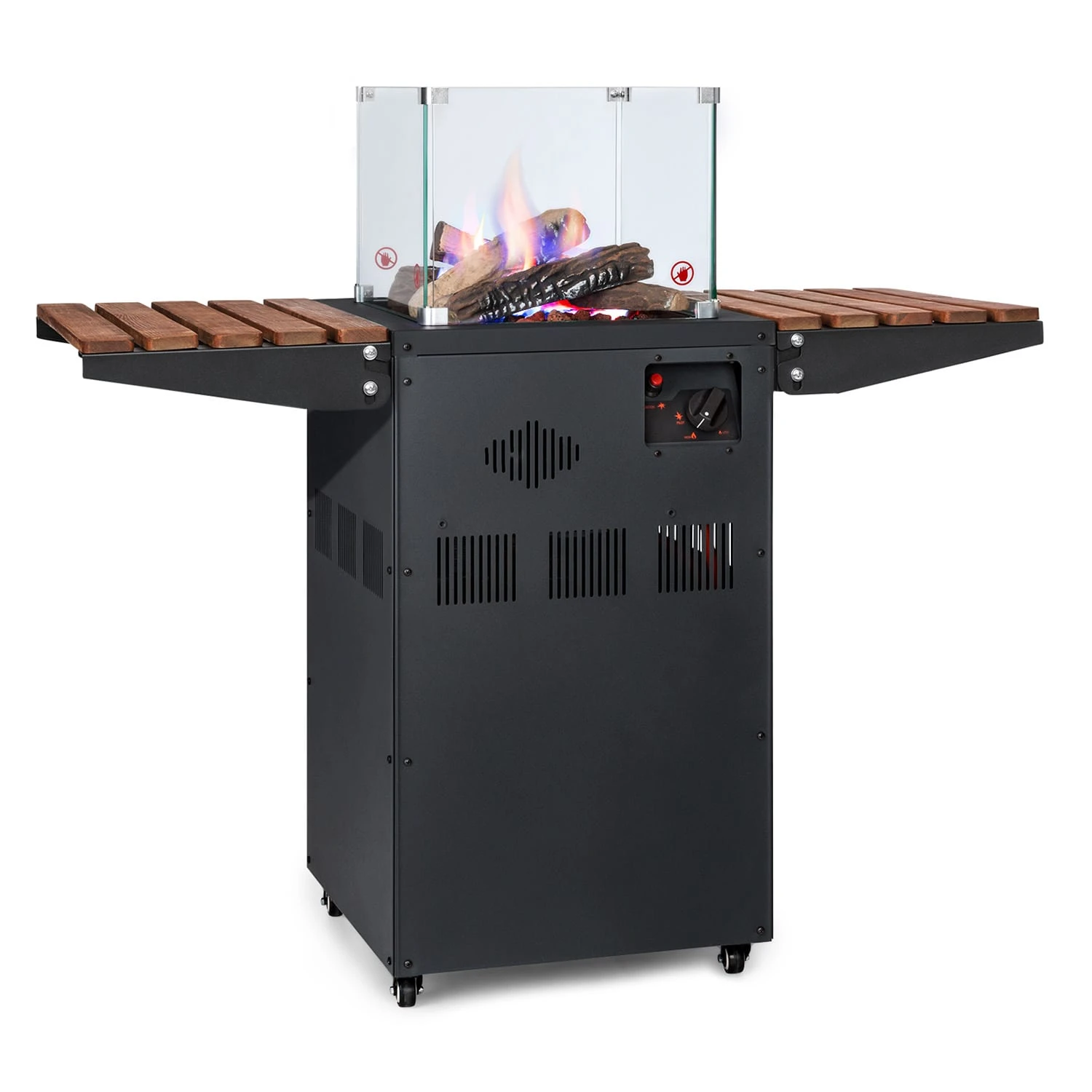 Leistungsstark und energieeffizient: Der blumfeldt Flagranti Plus Gasheizstrahler ist zur Verwendung mit Propan- oder Butan-Flüssiggasflaschen mit bis zu 13 kg geeignet, die ganz einfach im geräumigen Innenraum Platz finden. Entfacht wird das Gerät unkompliziert über das integrierte elektrische Zündsystem. Mit einem mehrstufigen Regler sowie einem mitgelieferten Schlauch mit Druckminderer wird die Zufuhr des Gases reguliert. Die Gasheizung erzeugt bis zu 8 kW Heizleistung und versorgt den Aufstellort sowie die Personen im näheren Umkreis schnell und effektiv mit angenehm wohliger Wärme. Zu beiden Seiten des Flagranti Plus sind praktische Seitentische aus Holz angebracht, die einfach ein- und ausgeklappt werden können und hervorragend zum Abstellen von Gläsern sind. Im Mittelpunkt steht natürlich die fulminante Flamme, die du durch 4 große Sichtfenster aus gehärtetem Glas sehen kannst. Umrandet wird die Gasflamme von einer ansehnlichen Lavastein- und Holzdekoration, die für ein beeindruckendes und ungefährliches Schauspiel sorgt. Vier Bodenrollen erleichtern das Versetzen des blumfeldt Flagranti Plus Gasheizstrahlers, während zuverlässige Feststellbremsen jederzeit den sicheren Stand der Freiluftheizung garantieren. Die korrosionsbeständige Bauweise aus Edelstahl macht das Gerät besonders langlebig und für die Aufstellung in Außenbereichen geeignet. Eine integrierte Sicherung unterbricht die Gaszufuhr zum Brenner, falls dieser zu Kippen droht. So ausgerüstet erweitert er die Freiluftsaison um ein paar weitere Monate mit behaglicher Wärme.