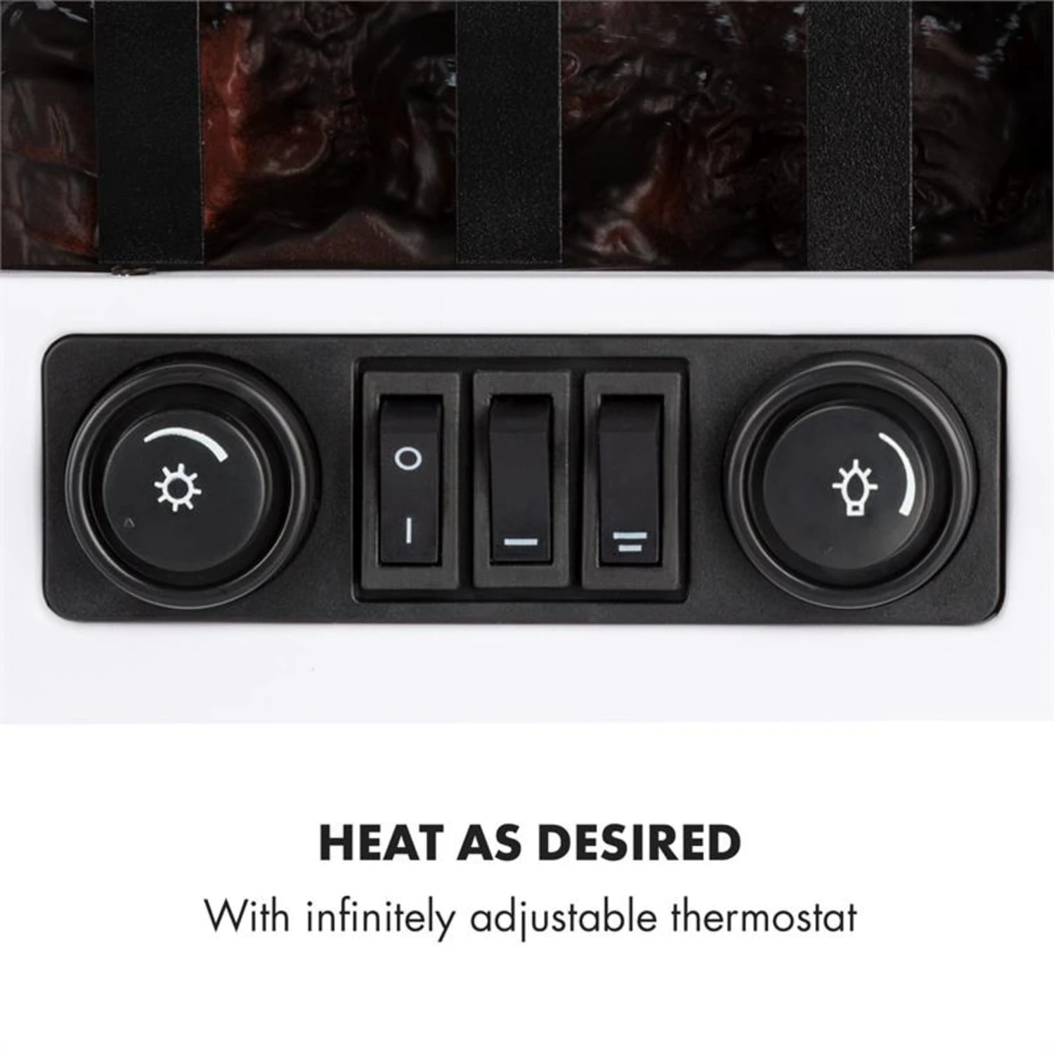 Die Flammen züngeln völlig unabhängig von der Heizfunktion auch in lauen Sommernächten. Für angenehme Wärme sorgt auf Wunsch die zuschaltbare Heizfunktion, die bei wahlweise 1000 oder 2000 Watt Räume bis 30 m² beheizt. Die Bedienung des Elektrokamins erfolgt direkt am Gerät: Die Schalter hierfür sind dezent hinter der Ofentür verborgen. Über Drehregler lassen sich hier auch die Temperatur und Intensität des Flammeneffekts einfach kontrollieren.