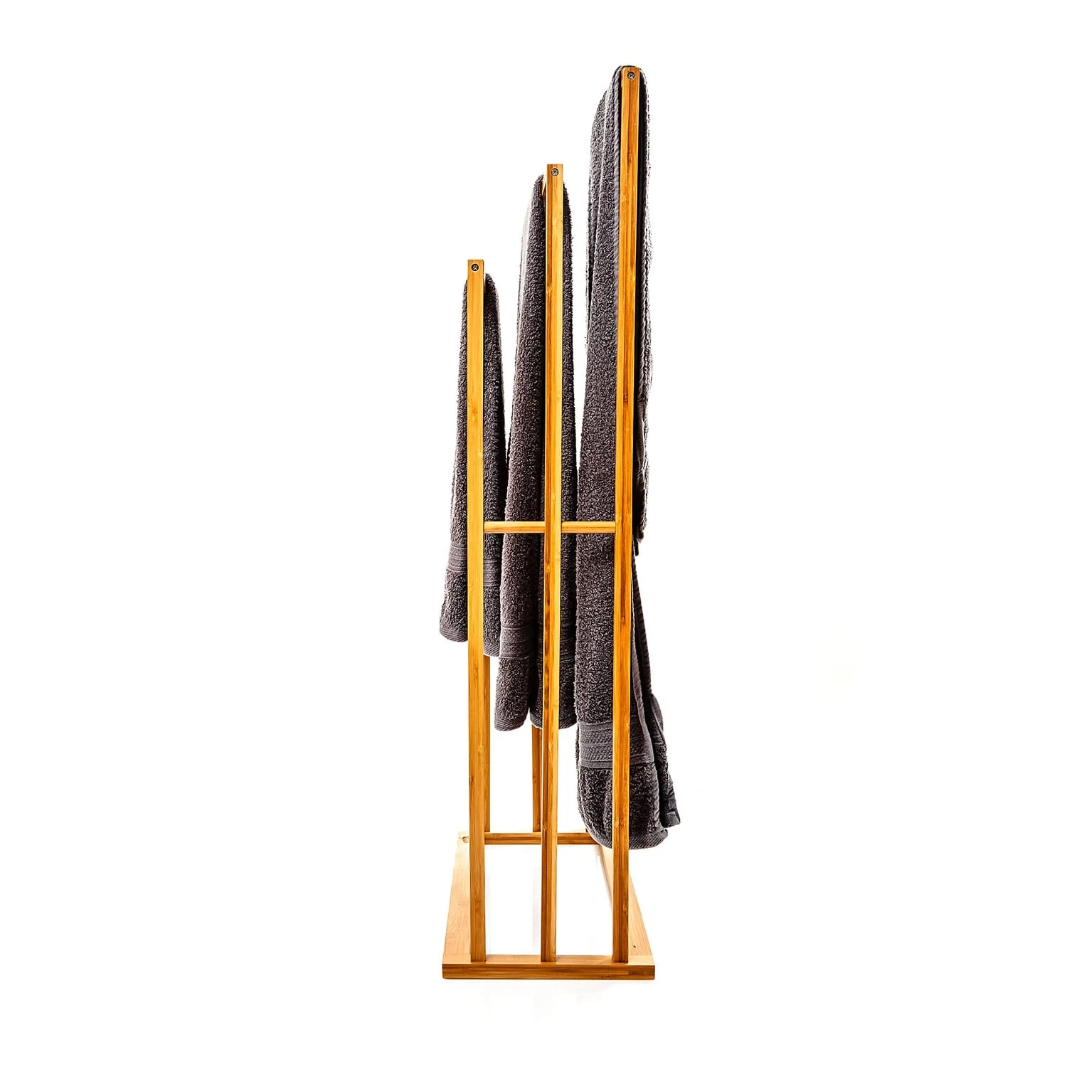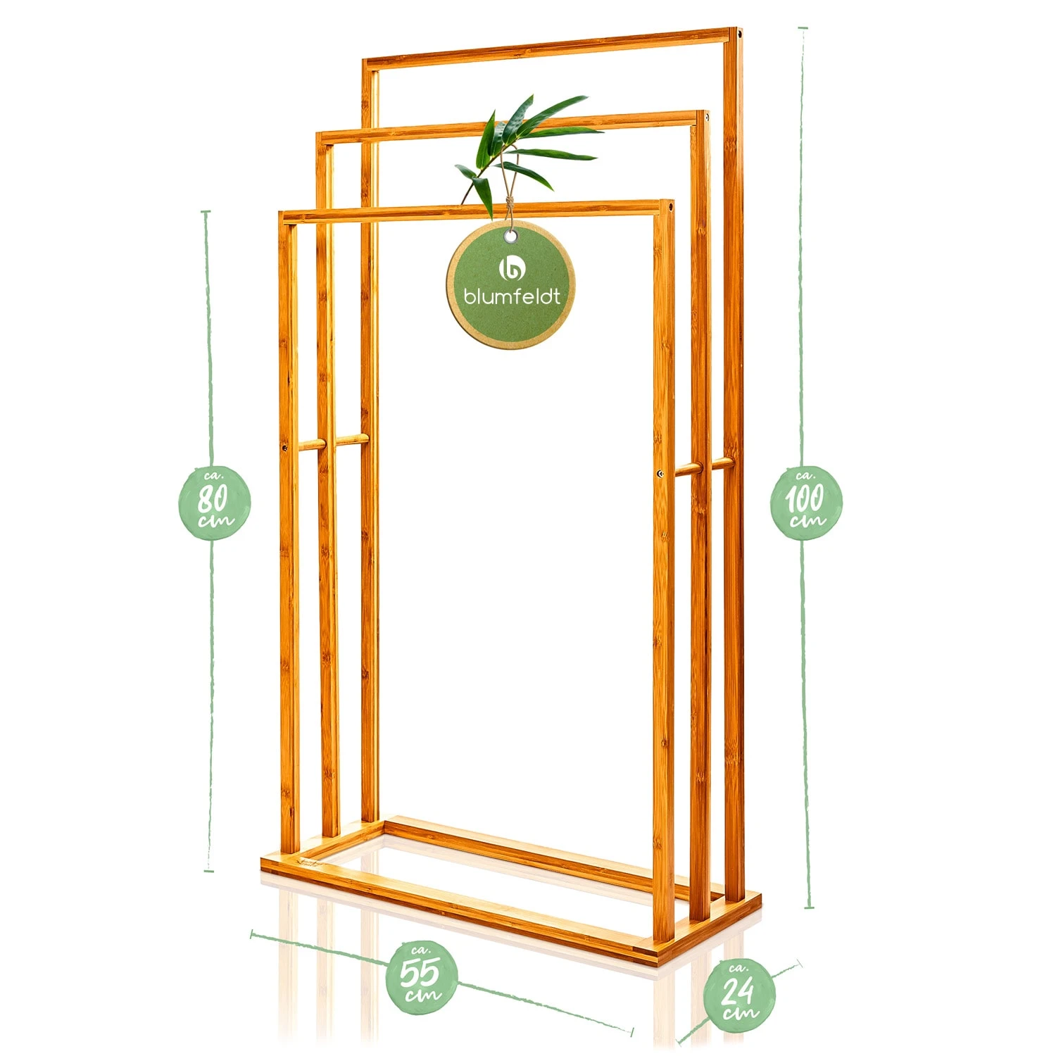Wer kennt das nicht? Das Handtuch ist im Weg, denn es hängt über Badewannenrand oder Duschkabine. Es stört auf der Heizung oder kann nicht richtig trocknen, da es platzsparend aufgehängt werden muss. Damit ist nun Schluss, denn dank dem blumfeldt Handtuchhalter kannst du deine Handtücher perfekt ausbreiten und trocknen. Dazu ist der Handtuchständer eine pure Augenweide: kantig konstruiert und aus echtem Bambus hergestellt wirkt er wie ein Designerstück fürs Badezimmer.