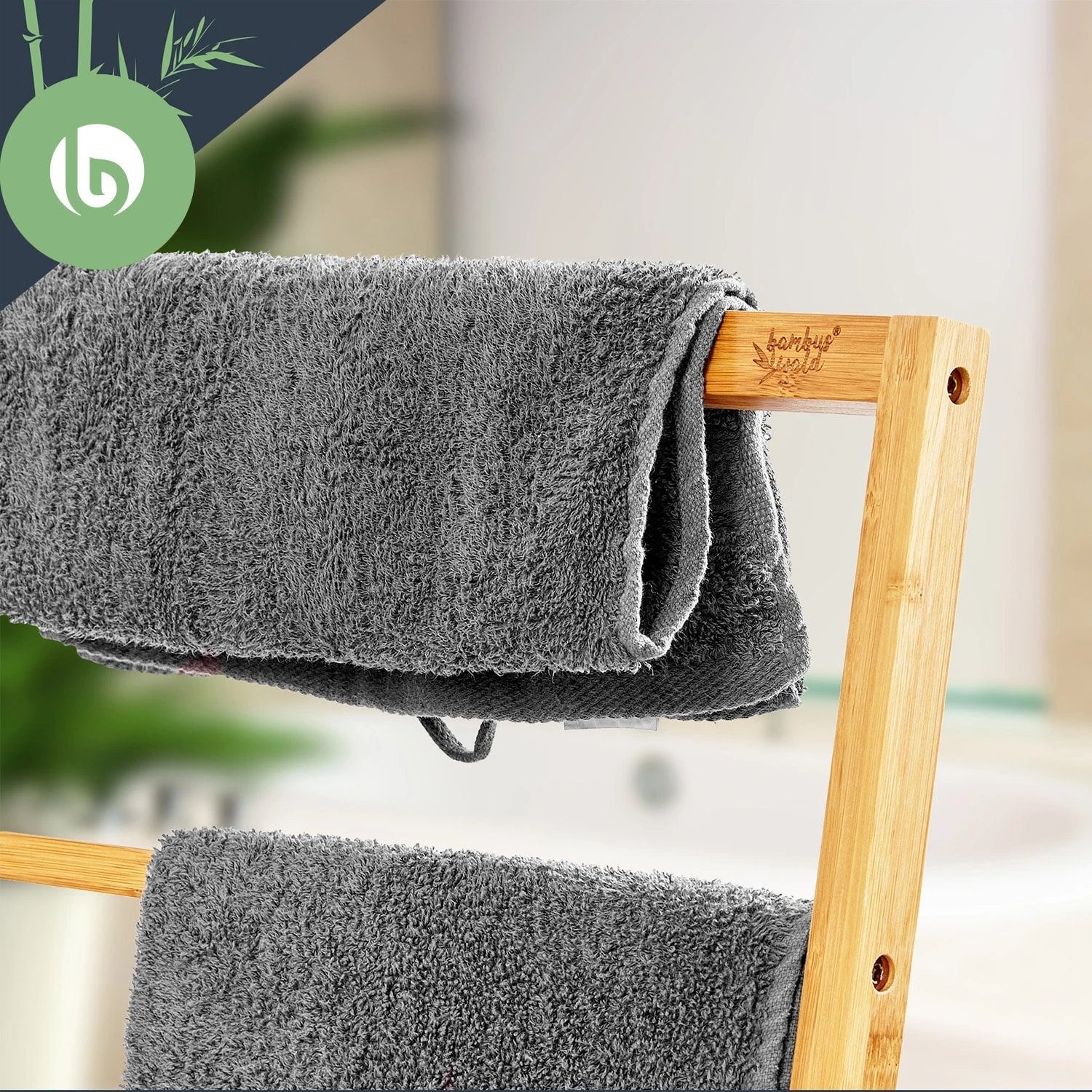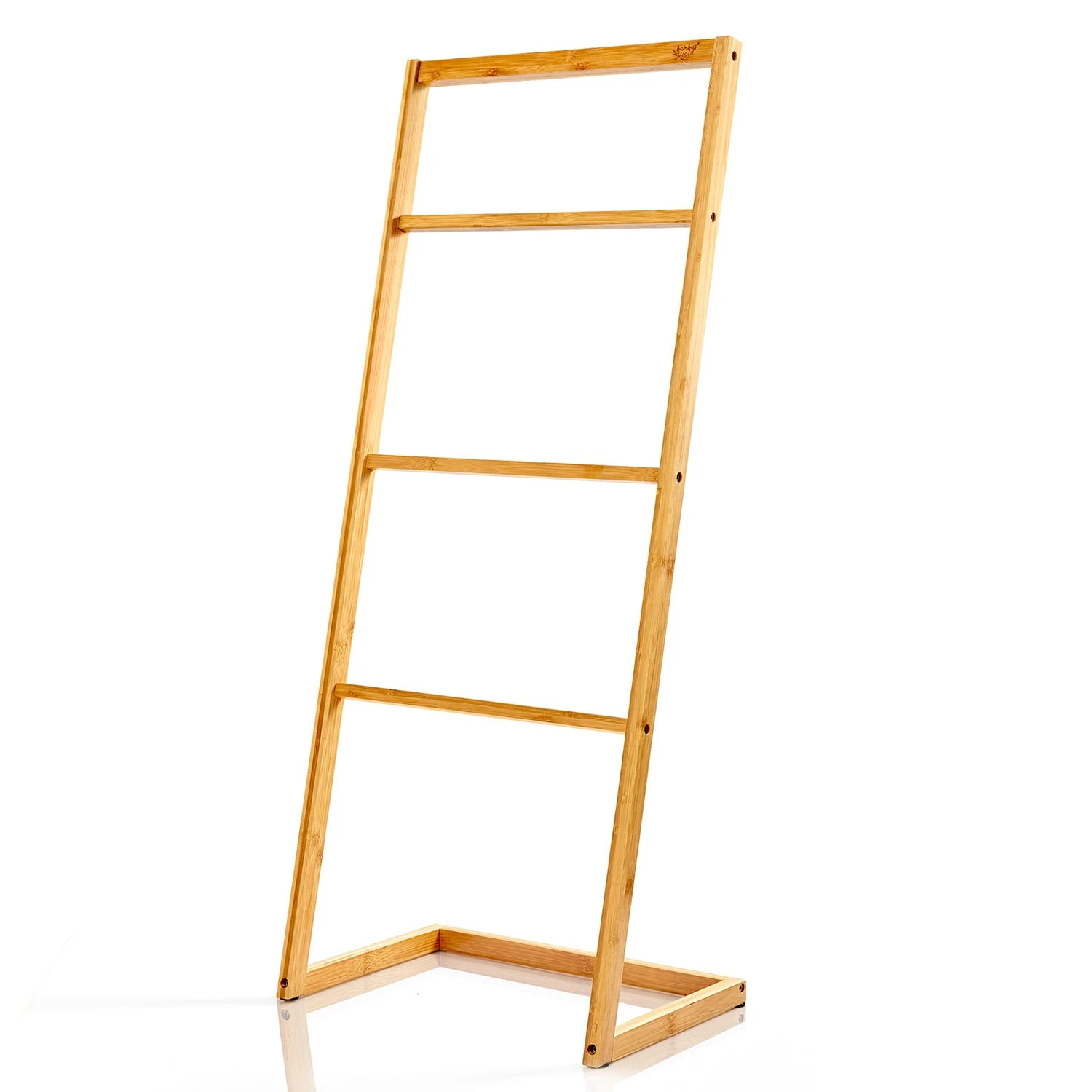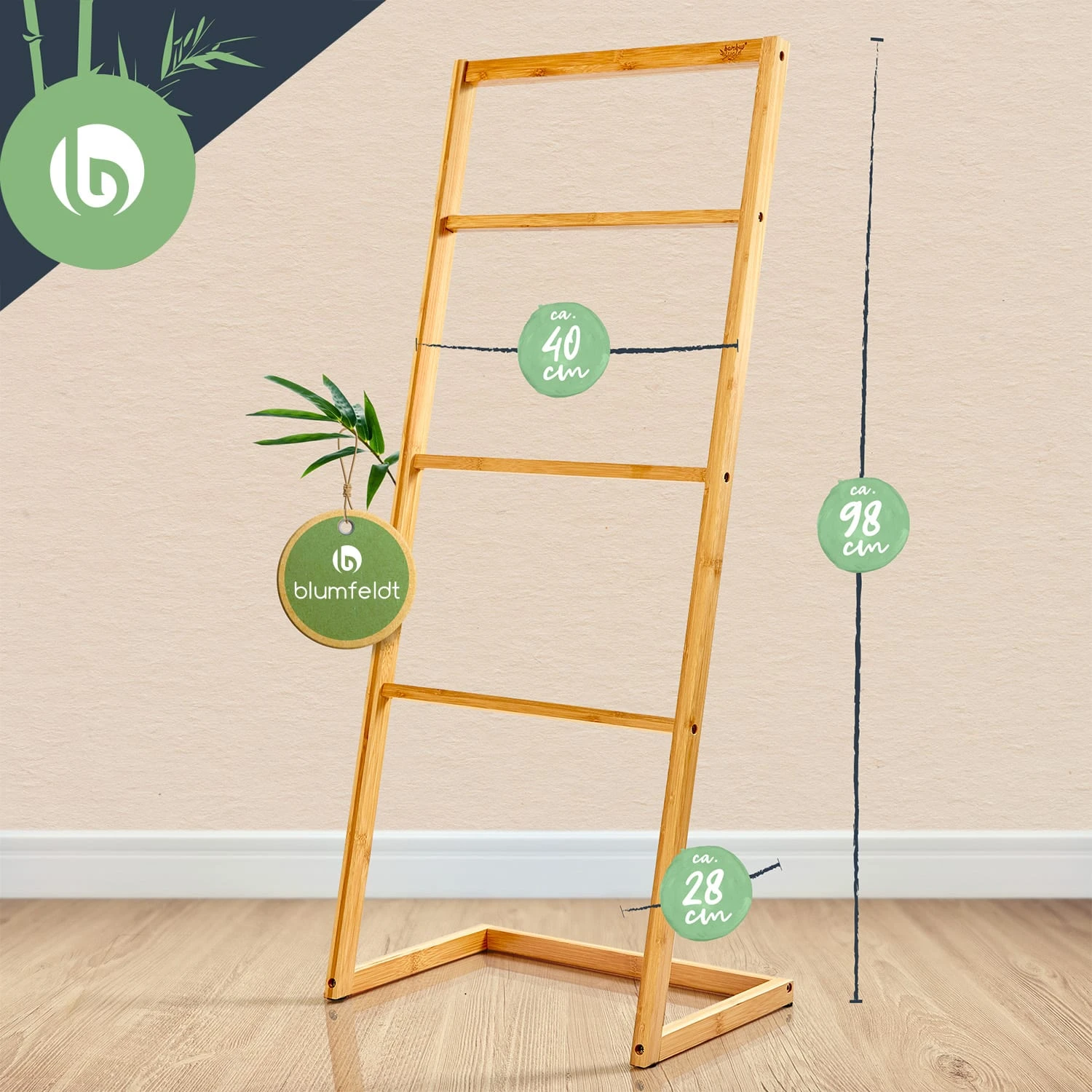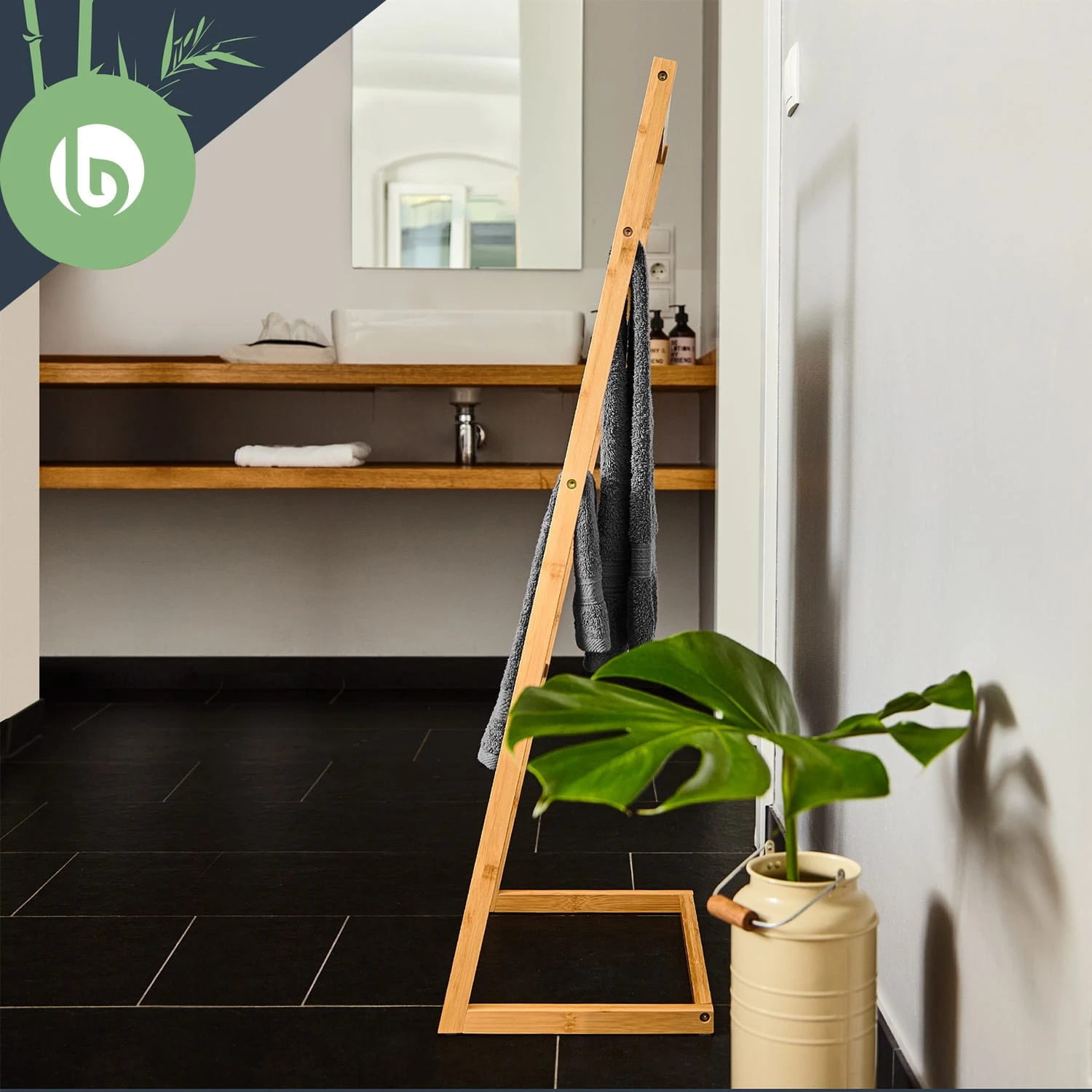 Wer kennt das nicht? Das Handtuch ist im Weg, denn es hängt über Badewannenrand oder Duschkabine. Es stört auf der Heizung oder kann nicht richtig trocknen, da es platzsparend aufgehängt werden muss. Damit ist nun Schluss, denn dank der blumfeldt Handtuchleiter kannst du deine Handtücher perfekt ausbreiten und trocknen. Dazu ist der Handtuchhalter eine pure Augenweide: kantig konstruiert und aus echtem Bambus hergestellt wirkt er wie ein Designerstück fürs Badezimmer. Besonders schön ist dabei die schräge Konstruktion, denn die Handtuchleiter ist latent nach hinten geneigt. Dennoch kann sie freistehend positioniert werden, ohne zu wackeln.
