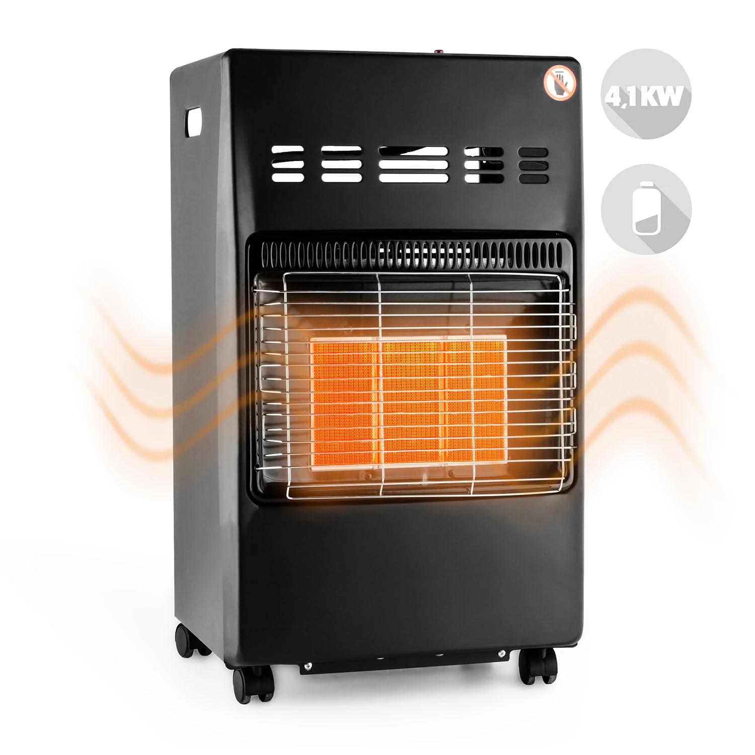 Vier Bodenrollen erleichtern das Versetzen des DURAMAXX Kamtschatka Gasheizofen, während ein Sicherheitsgitter den Keramikbrenner vor ungewolltem Zugriff abschirmt.