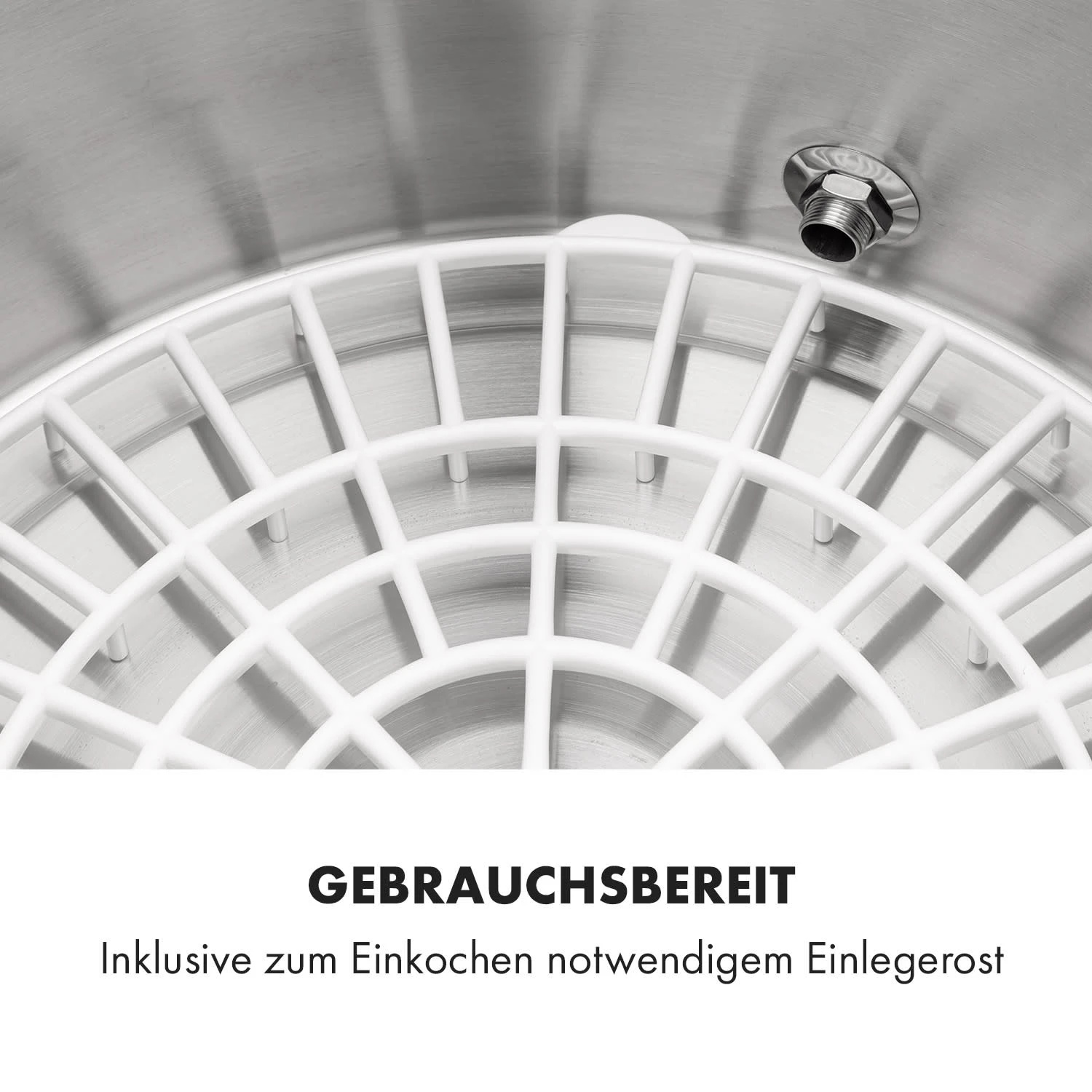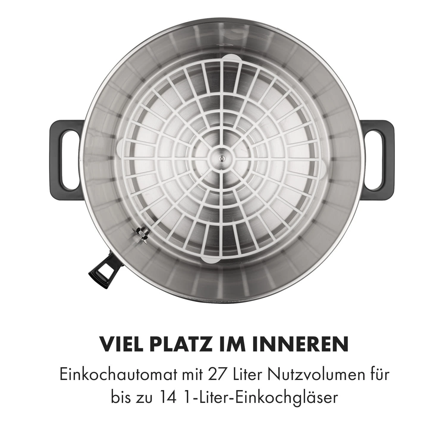 Heute wird gekocht, eingekocht! Mit dem Klarstein Lady Marmalade Einkochtopf kommt Abwechslung auf den Speiseplan – mit Langzeiteffekt. Der große Einkocher mit 27 Litern Nutzinhalt bietet genug Platz, um den Inhalt von bis zu 14 1-Liter-Einkochgläsern mit Hitze in haltbare Konserven zu verwandeln. Egal ob die Obst- oder Gemüseernte, wie Kirschen, Bohnen oder Erbsen aus dem Garten, Gewürzgurken, süße Marmeladenkreationen, herzhafte Wurstmasse oder fertig zubereitetes Gulasch, Braten und Rouladen – im Lady Marmalade werden sie haltbar gemacht. Die Bedienung ist denkbar einfach: Gefüllte Gläser in den Topf stellen, Wasser einfüllen, dann die notwendige Einkochtemperatur zwischen 30 und 100 °C wählen, Einkochzeit von 5 Minuten bis 12 Stunden einstellen und schon kann es losgehen. Besonders hilfreich ist dabei die integrierte Digitalanzeige, auf der man sämtliche Einstellungen ablesen kann. Der Topf hält selbstständig die gewählte Temperatur und schaltet sich am Ende der Einkochzeit allein ab. Ein Überhitzungsschutz sorgt für Sicherheit beim Einkochen und schaltet den Topf aus, wenn er zu heiß wird oder er trocken läuft.