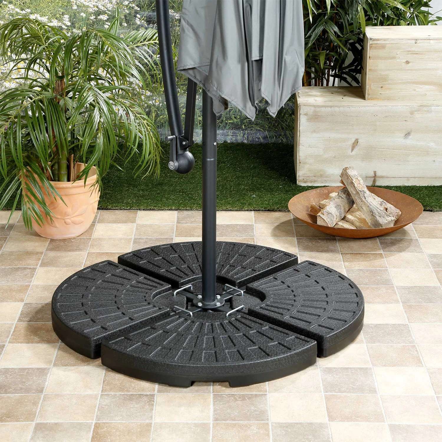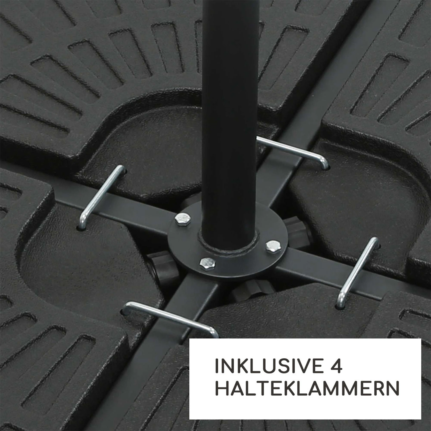 Neben ihrer zuverlässigen Funktion als Beschwerungselemente überzeugen die Sonnenschirmständer-Gewichte auch in Optik und Komfort. Sie passen sich geschickt an das Bodenkreuz deines Schirmständers an und ergeben so einen modernen Sockel. Ein seitlicher Tragegriff macht die Leergewichte zu einem sehr praktischen Sommer-Accessoire.