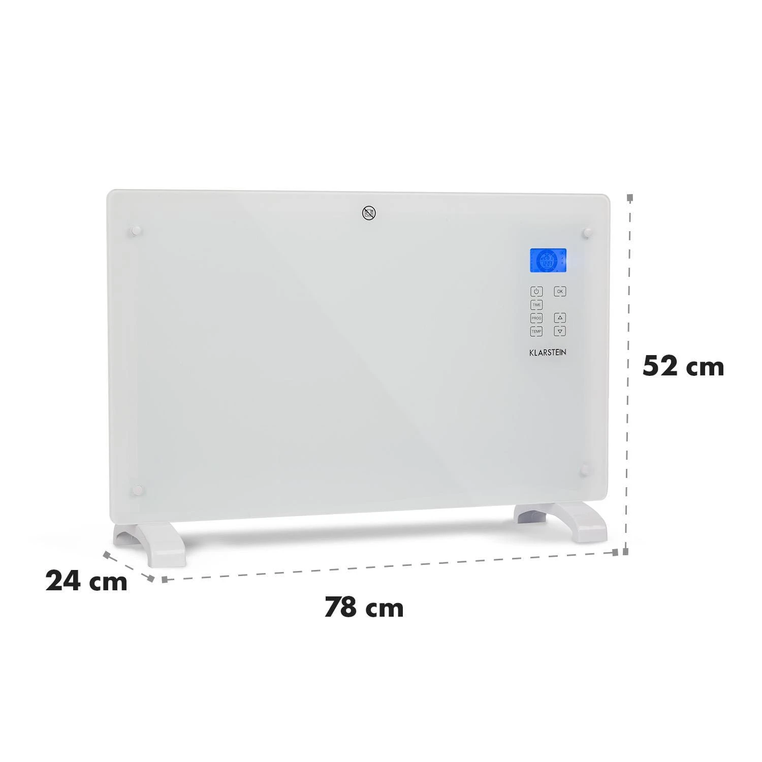 - Maße (Heizgerät ohne Glaspanel): ca. 71,7 x 44 x 7 cm (BxHxT)