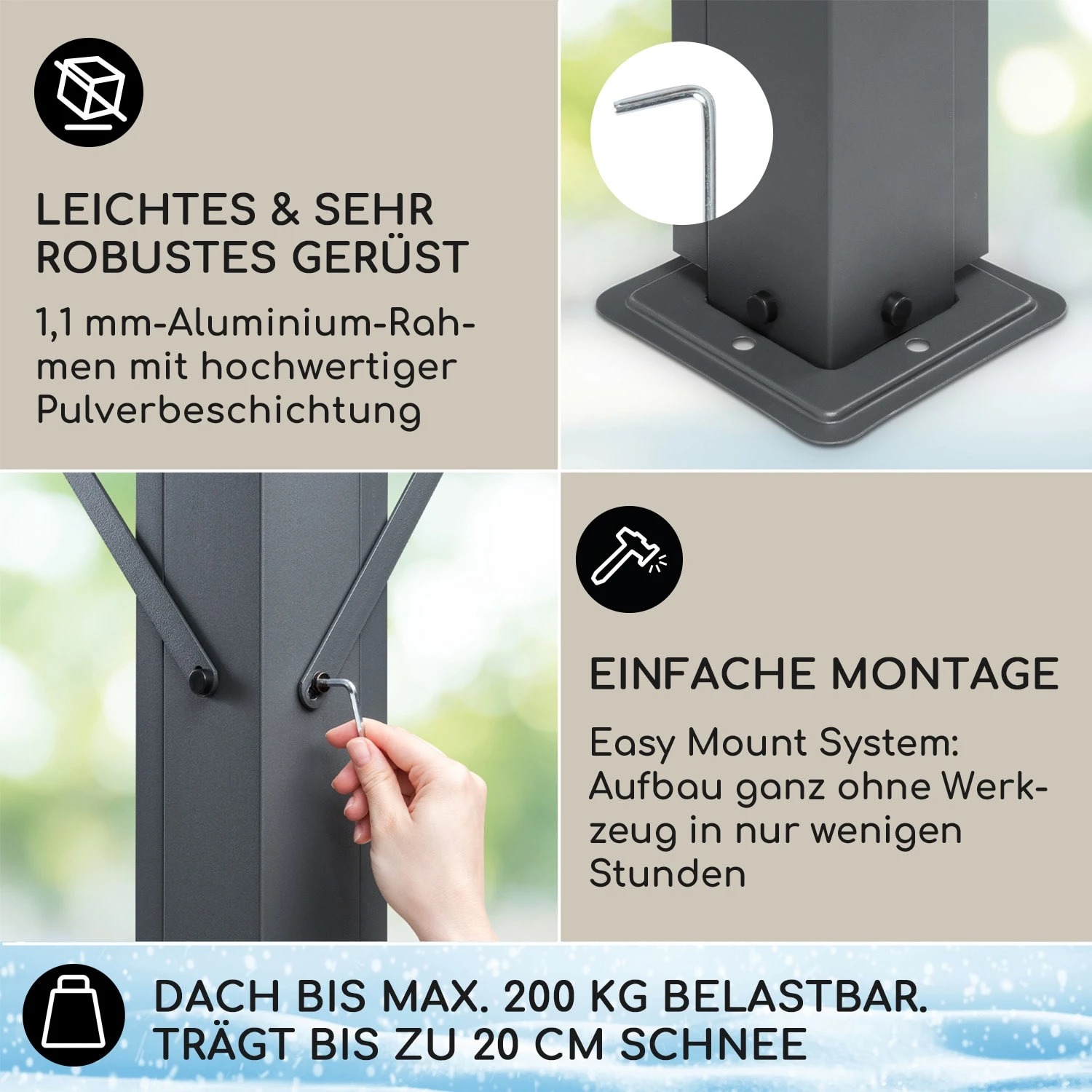 Schön, stabil und flexibel, so muss ein Gartenpavillon sein, damit der Aufenthalt im Garten oder auf der Terrasse zum Erlebnis wird. Der blumfeldt Pantheon Solid Sky Expand Pavillon wird deine Erwartungen übertreffen: Die 3 x 5,6 m große Pergola (max. Größe) macht mit ihrem schlichten Design und der dezenten Farbgebung nicht nur eine gute Figur. Ihre Konstruktion aus pulverbeschichteten Aluminiumstangen verleiht ihr zudem eine hohe Stabilität und ist zugleich besonders leicht. Des Weiteren überzeugt der Pavillon durch seinen einfachen Aufbau ohne zusätzliches Werkzeug. Für besten Schutz in allen Lagen sorgt das leicht schräge Dach aus 6 mm starken, wasserabweisenden und leicht getönten Polycarbonat-Platten. So hat Regen gleich zweifach keine Chance, die gute Laune zu trüben. Dank seiner zwei Pfosten mit Rollen lässt sich die Größe der Dachfläche flexibel, einfach und individuell anpassen. Zusätzlich kannst du den Pavillon auch als Carport oder Unterstand für Fahrräder, Gartengeräte oder -werkzeug nutzen.