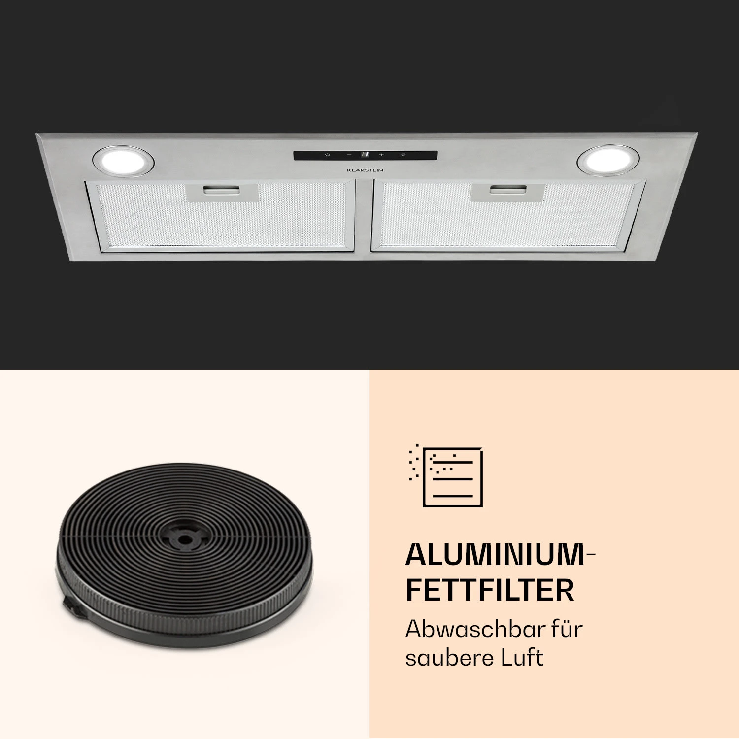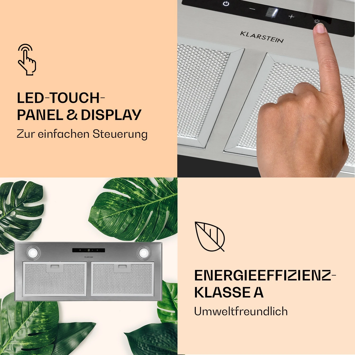Beste Luft in der Küche: Die Klarstein Paolo Dunstabzugshaube verschwindet randlos in der Küchenhänge. Von dort beseitigt sie schwungvoll Dampf und Dunst beim Kochen – mit 200 Watt Motorleistung, drei Geschwindigkeiten und bis zu 593 m³/h Abluftleistung. Per unkomplizierter Touch-Bediensektion kannst du Lüftung und Beleuchtung steuern und ein Abschalttimer lüftet auf Wunsch für 1 bis 9 Minuten nach und schaltet das Gerät danach ab.