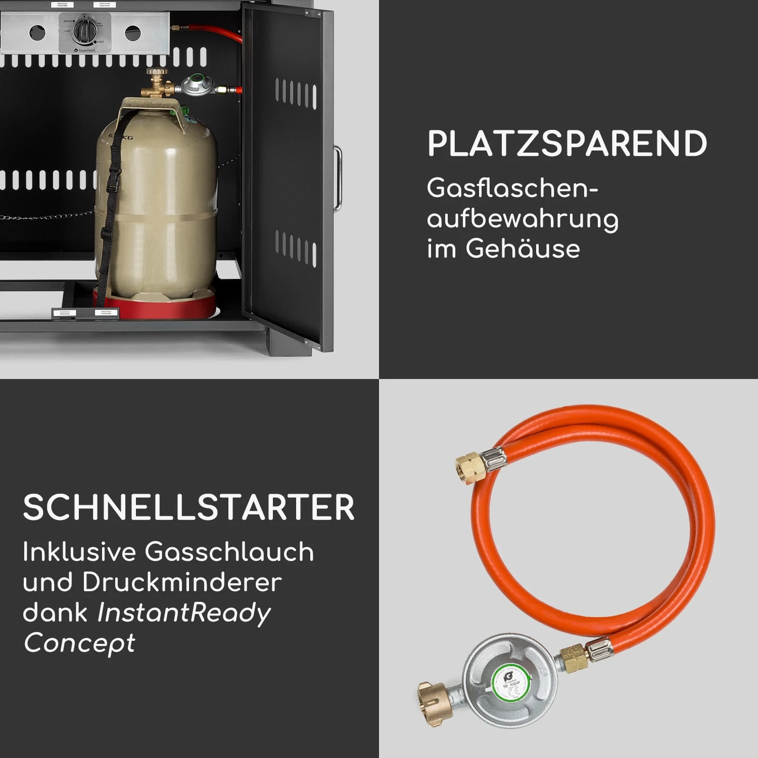 - geeignet zur Verwendung mit Butan- oder Propanflüssiggasflaschen bis 15 kg (Gasarten G30 & G31 sowie deren Mischungen)